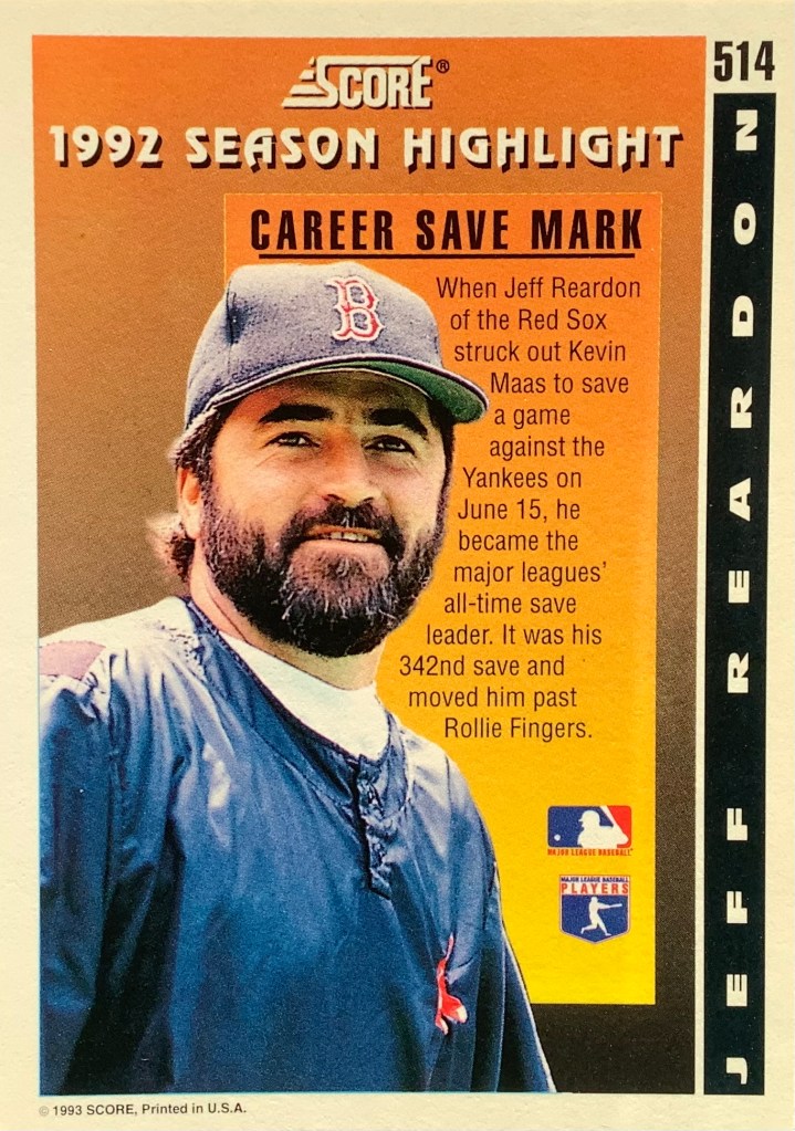 I played against Jeff in Little League, and my team defeated his for the Little League title. Obviously, his future baseball career eclipsed mine by miles. This 1993 card from SCORE salutes Jeff’s accomplishment in passing Rollie Fingers as the then career Major League leader in saves by a reliever.