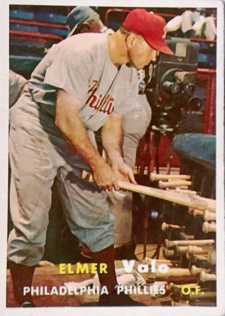 If you are at all interested in baseball cards, you have to love this one from the 1957 Topps series. The card features a terrific graphic of Elmer Valo choosing his lumber from the bat rack.