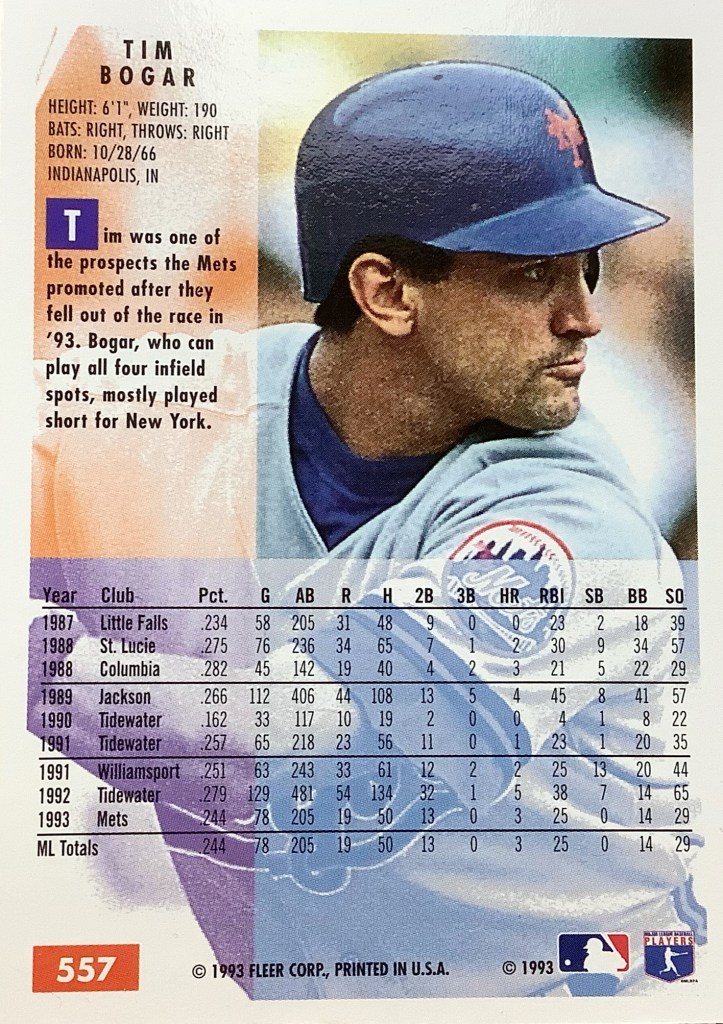 Bogar played 9 seasons in the Major Leagues with three different teams, including the Houston Astros’ “Killer Bees” of the late 1990s. After his playing days, he moved on to a distinguished coaching and management career in Major League Baseball, including a stint in 2012 as RedSox bench coach under manager Bobby Valentine, a season that most Red Sox fans would unfortunately like to forget. The card is from the 1994 Fleer set. The set features terrific photos and a beautiful design.
