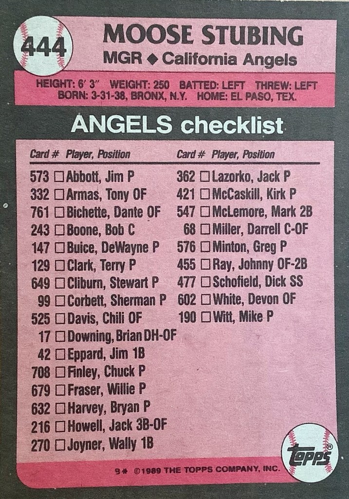 This is the only Major League card on which Moose Stubing appeared, 1989 Topps, as Manager of the California Angels. Stubing had taken over for the fired Cookie Rojas at the end of the 1988 season, but was replaced by Doug Rader at the beginning of the 1989 season.